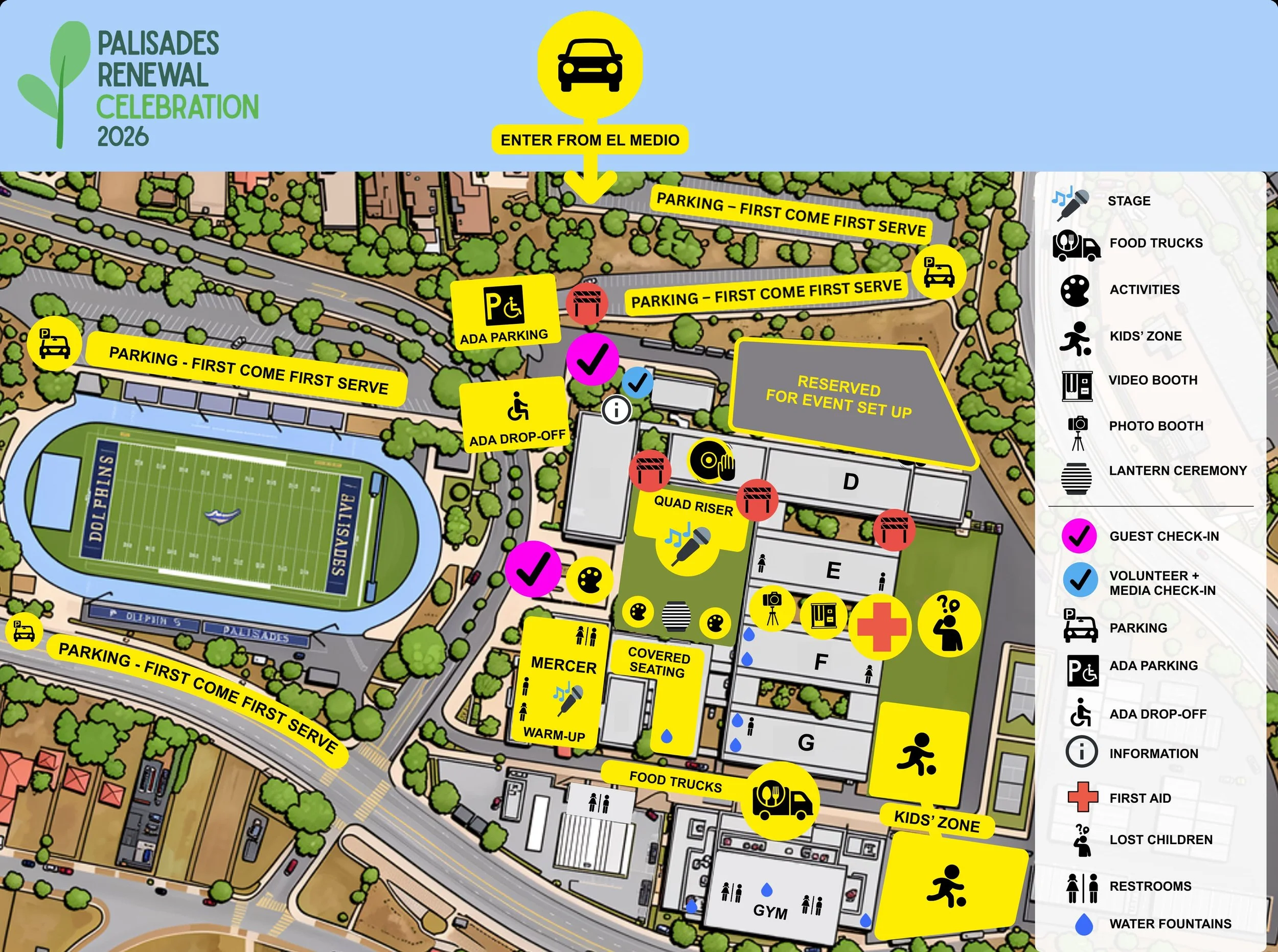 Our Palisades Renewal Celebration is a community gathering — not a commercial festival — created by your neighbors and supported by over 30 local organizations. Join us for live music, food trucks, art & family activities, and space to sit and talk. Kids can play. Just leave the pets at home and bring a smile.